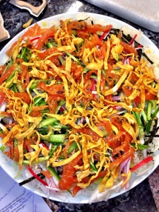 Chirasi sushi – a new dish for me as I have never seen sushi like this. The sushi rice is spread out on a bamboo platter, with the shredded nori seaweed sprinkled over the top. Next some fake(!) crab, smoked salmon and egg pancakes were all scattered over, and it was finished with some sesame seeds. Again, delicious but refreshingly different – actually it made me think of a sushi cake!
